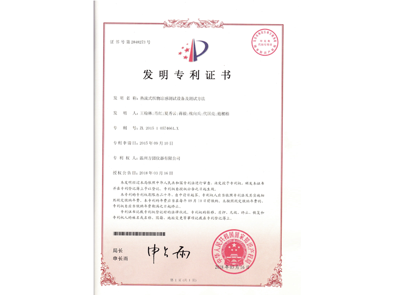 中國發(fā)明專利:熱流式織物涼感測試設備及測試方法(ZL 2015 1 0574661.X)