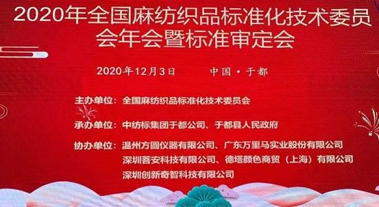 2020123, 全國麻紡織品標準化技術(shù)委員會第四屆第四次委員代表大會在江西·于都順利召開。本屆大會由全國麻紡織品標準化技術(shù)委員會主辦,中紡標集團于都公司、于都縣人民政府承辦,溫州方圓儀器有限公司、廣東萬里馬實業(yè)股份有限公司、深圳菩安科技有限公司、德塔顏色商貿(mào)(上海)有限公司、深圳創(chuàng)新奇智科技有限公司協(xié)辦。